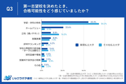 今回の調査から、難関私立大学合格者とその他の私立大学合格者が第一志望大学を選ぶ際に最も重要視した要素について、その違いと共通点が明らかになったので以下で詳しくお伝えします。