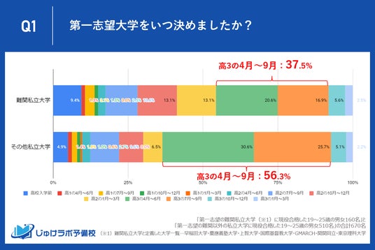じゅけラボ予備校(所在地:大阪市北区、代表取締役:後藤智則)は、第一志望の難関私立大学(※1)に現役合格した160名とそれ以外の第一志望の私立大学に現役合格した510名の合計670名を対象に、受験勉強の開始時期や勉強時間に関する調査を実施しました。