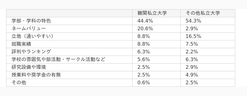 就職実績を重視すると答えた割合は、難関私立大学とその他の私立大学がほぼ同じで、それぞれ8.8%と7.5%でした。これは、どちらのグループの学生も、大学が提供するキャリアサポートや卒業後の就職に関する実績を重要な判断材料としていることを示しています。