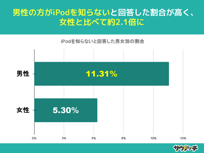 iPodを知らないと回答した割合を男女別でみてみますと、男性が約11%、女性が約5%で、女性と比べて男性は約2.1倍高い結果となりました。