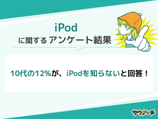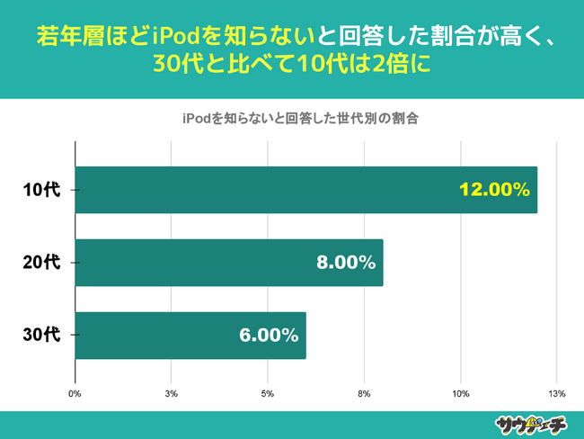iPodを知らないと回答した割合を世代別でみてみますと、10代の12%が最も高く、次いで20代の8%、30代が6%で、30代と比べて10代は2倍高い結果となりました。