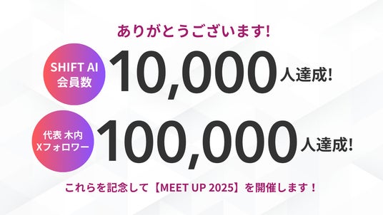 株式会社SHIFT AI(東京都渋谷区、代表取締役 木内翔大、以下「当社」)は、2025年1月4日、当社代表 木内翔大のX(旧Twitter)アカウント(@shota7180)のフォロワー数が10万人を達成しました。また当社が運営するAI大学「SHIFT AI」( https://lp.shift-ai.co.jp/ )の有料会員数が1万人を達成したこともお知らせいたします。