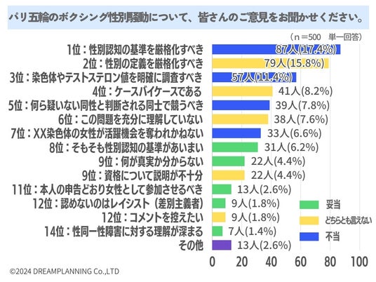「ボクシングは体格差によって命の危険もあるので、染色体ベースでの性別判断をするべきかと思う。選手本人の性自認については、議論のすり替えだと感じる。(20代・女性)」