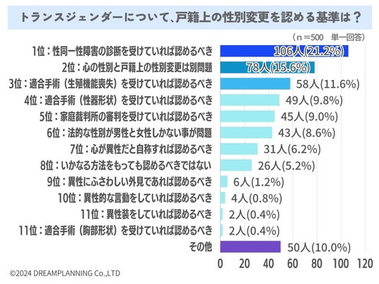 ★ 1位:性同一性障害の診断を受けていれば認めるべき 106/500名(21.2%) ★