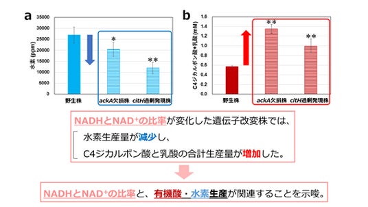 結果、野生株と比較して、NADH/NAD+比に変化がみられたのは、ackA欠損株とcitH過剰発現株の2株であり、この2株では、NADH/NAD+比が低下しました(図1)。また、ackA欠損株とcitH過剰発現株では、水素の生産量が減少し、有機酸のうち、NADHを用いる反応の生成物であるC4ジカルボン酸と乳酸の合計生産量が増加しました(図2aおよびb)。リンゴ酸デヒドロゲナーゼは、その触媒反応にNADHを用いるため、リンゴ酸デヒドロゲナーゼ遺伝子の改変によってNADH/NAD+比が変化することは予測されますが、触媒反応にNADHを用いない酢酸キナーゼ遺伝子の改変によっても、NADH/NAD+比が変化したことは、注目すべきであると考えられます。