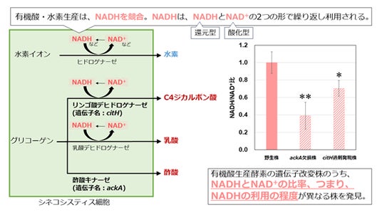 - シネコシスティスの有機酸生産に関与する酵素を欠損または過剰発現させた遺伝子改変株の解析により、有機酸や水素の生産と、NADHという物質の酸化型と還元型の比率であるNADH/NAD+比が関連していることを明らかにした。