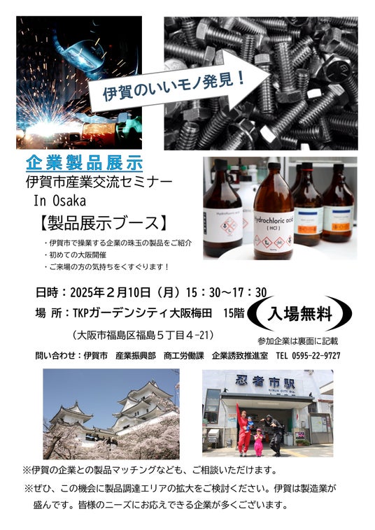 2025年2月10日(月)に「TKPガーデンシティ大阪梅田」(大阪市福島区福島)15Fにて、伊賀市内で操業している企業12社による企業製品展示を行います。開催時間は15:30~17:30でどなたでも無料で入場可能。