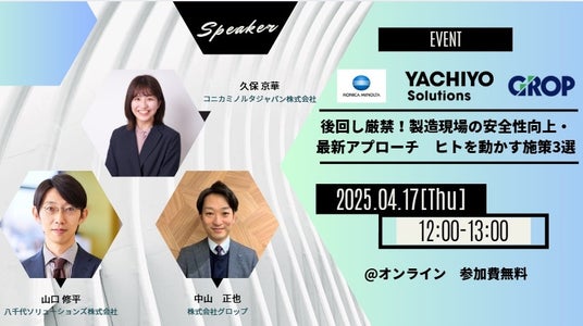 八千代エンジニヤリング株式会社(本店:東京都台東区、代表取締役社長執行役員:高橋 努)のグループ会社である八千代ソリューションズ株式会社(本店:東京都台東区、代表取締役社長:水野 高志、以下「八千代ソリューションズ」)は、株式会社グロップ(本社:岡山県岡山市、代表取締役社長:原田 竜一郎)、コニカミノルタジャパン株式会社(本社:東京都港区、代表取締役社長:一條 啓介)と共同で、製造現場における安全性向上をテーマとした無料ウェビナーを、2025年4月17日(木)12:00~13:00に開催します。