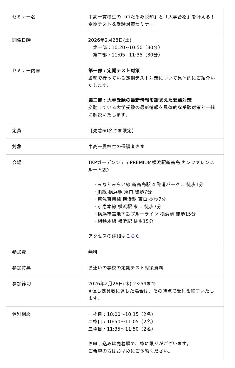 そこで本セミナーでは、具体的な「定期テスト対策」と、最新の大学受験情報を元にした「受験対策」を詳しく解説いたします。 学年末を迎えるこの時期に、改めてお子さまの学習環境を見直し、新学年に向けた確かな一歩を踏み出していただくための機会として開催いたします。