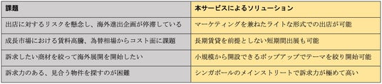 多くの日本食品メーカーが海外展開を検討する一方で、高い初期投資と長期契約への不安、物件探しや現地市場への情報不足、現地消費者に対する効果的な訴求方法が分からないなどの課題に直面しています。本サービスでは、これらの課題を解消する「ポップアップストア形式の短期出店」を提供。現地でのマーケティングを兼ねて小規模からスタートできるため、海外進出のリスクを大幅に低減します。
