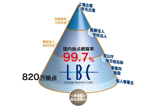 LBCは国内820万件の事業拠点を網羅しており(網羅率99.7%)、国内最大の法人企業データベースであると自負しています。「日本に存在するすべての企業情報を整理する」という理念のもと、収集と更新を続けており、過去の情報を含めると1,200万件を超える情報量を保持しています。