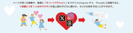 ●参加方法: 期間中にInstagram、X、Threadsでハートの写真や動画に「#ハートアクション」を付けて投稿すると、1投稿につき1人分のワクチンが支援国(ミャンマー、ラオス、ブータン、バヌアツ)の子ども達に寄付されます。