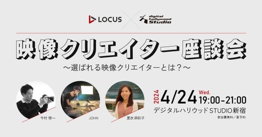 動画を起点として、2,000社以上の企業にコンサルティング事業を展開している株式会社LOCUS(ローカス、本社:東京都千代田区、代表取締役:瀧良太)は、Webや動画などが学べ、全国に展開しているラーニングスタジオ『デジタルハリウッドSTUDIO』のSTUDIO新宿で、映像クリエイター向けイベント「映像制作会社LOCUSで活躍するクリエイター座談会~選ばれる映像クリエイターとは?~」を2024年4月24日(水)に開催いたします。