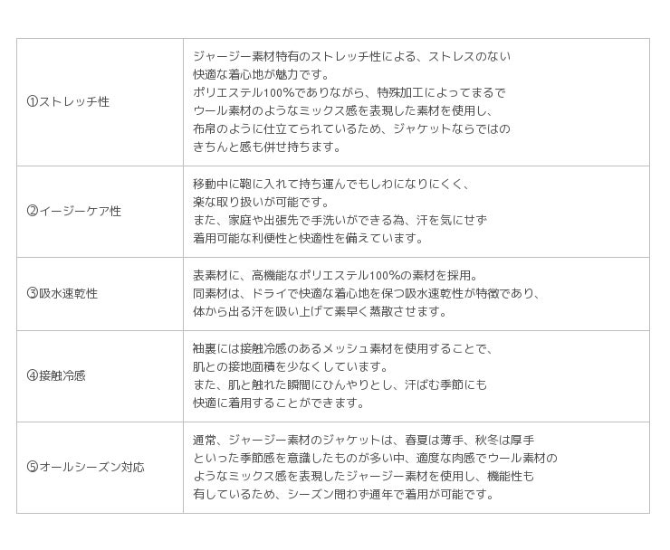 通常、ジャージー素材のジャケットは、春夏は薄手、秋冬は厚手といった季節感を意識したものが多い中、「トロッタージャケット#003」は、ポリエステル素材でありながら適度な肉感でまるでウール素材のようなミックス感を表現したジャージー素材を使用し、「トロッタージャケット#000」の持つ機能性も同様に装備することで、通年着用できるストレスフリーで快適なジャケットに仕立てました。