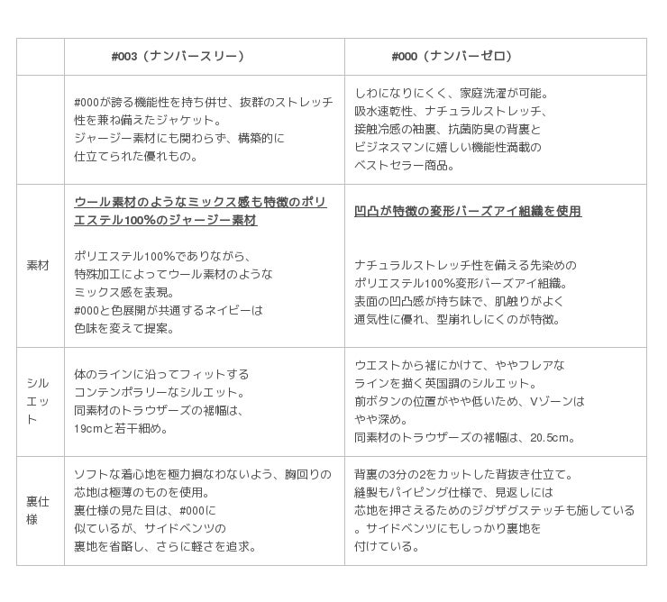 ベストセラー商品である「トロッタージャケット#000(ナンバーゼロ)」は、2013年2月より発売を開始し、累計販売着数が約2万5千着となる人気商品となっております。その商品は、しわになりにくく、吸水速乾性があり、家庭洗濯が可能であること等、多くのビジネスマンに役立つ機能性を兼ね備え、通年着用できるジャケットとしての人気を確立し、多くのお客様から好評をいただいております。その好評を受け、お客様のクローゼットにない「トロッタージャケット#000」に代わる新たな提案としてジャージー素材を使用した「トロッタージャケット#003(ナンバースリー)」を開発しました。
