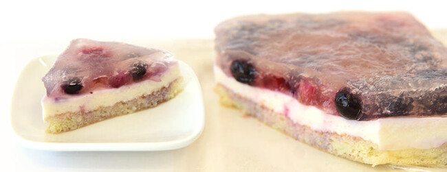 ブルーベリー、イチゴ、ラズベリー、クランベリーの4種のベリーが入った3層仕立てのババロアケーキです。1層目はスポンジ生地、2層目はババロア生地、3層目のデコレーションは、透明感あるゼリー生地に仕上げました。(内容量:270g、サイズ:約10cm正方形のケーキ型×高さ約3cm、価格:1,870円(税込)、原産国名:日本)
