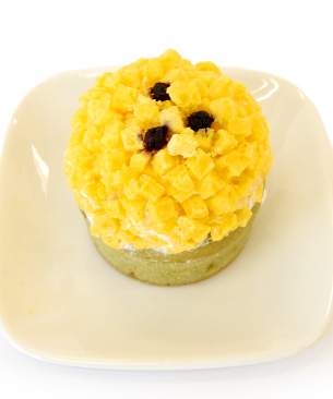 満開の「ミモザ」をイメージした春らしいケーキです。ワイルドブルーベリーを上に載せ、ミモザ特有の黄色くふわふわしたお花の部分はカボチャで色付けしたスポンジで表現しました。(内容量:70g、サイズ:縦横 約5cm×高さ 約5.5cm、価格:935円(税込)、原産国名:日本)
