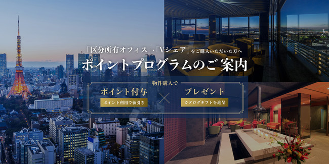 当社が売主となる「区分所有オフィス」、「Vシェア」をご購入いただいたお客様に、物件価格に応じて「ポイント」を付与するサービスです。付与されたポイントは次回以降、当社物件購入時に、ポイントを利用した値引きが可能です。物件価格(税込)の0.3%(10,000ポイント単位で切り上げ)をポイントとして付与し、物件の購入時に1ポイント1円換算で値引きします。例えば、5億円(税込)の物件をご購入していただいた場合、150万円分のポイントが付与され、次回物件ご購入時にポイント分を値引きした価格でご購入いただけます※1。