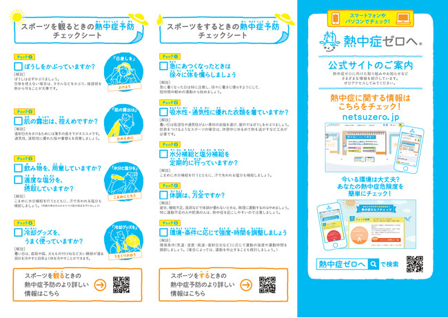 ラックにて配布するリーフレットでは、スポーツをするとき・スポーツを観るときの服装や水分・塩分の補給状況などを確認する「熱中症予防チェック」や、熱中症の症状解説や応急処置の方法を紹介しています。また、球場内で放映する啓発動画では、「日差しをよけよう」「水分と塩分をこまめにとろう」などの熱中症予防のポイントを15秒の動画でわかりやすく伝えます。