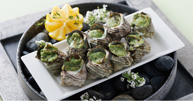 ガーリックオイル、ナッツ、パセリで焼き上げた姫サザエのブルギニョン。