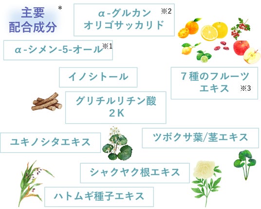 *全て整肌成分 ※1イソプロピルメチルフェノール ※2バイオエコリア ※3ライム果汁、オレンジ果汁、レモン果汁、グレープフルーツ果実エキス、サンザシエキス、ナツメ果実エキス、リンゴ果実エキス