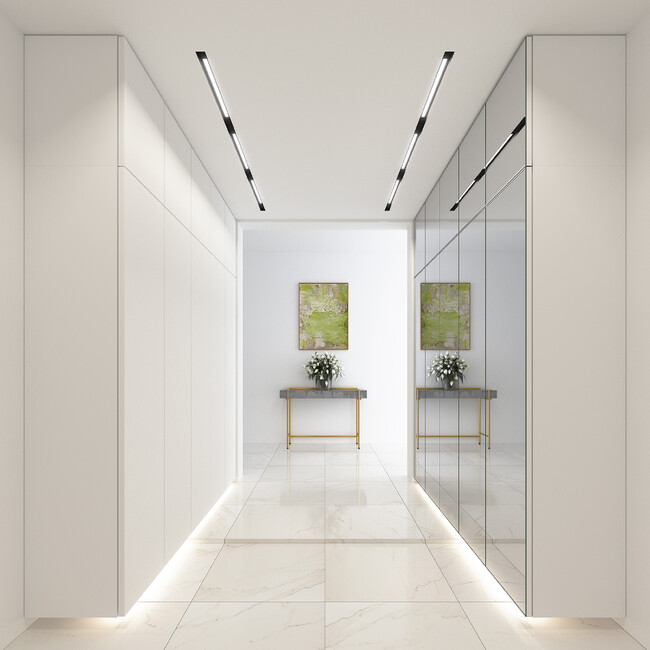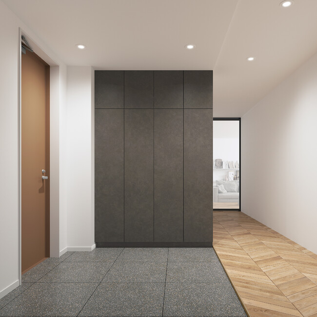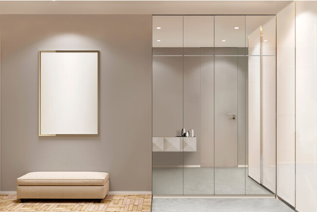 《シュールーム》は扉の継ぎ目を最小限に抑え、取手も付けないミニマルデザインにより、余計なものが何もない「面」の美しさを際立たせました。扉は玄関での姿見として使えるミラー仕様にすることが可能で、部分的な1列ミラー、もしくは連結した全面ミラーをお選びいただけます。1列ミラーはデザインのアクセントにもなり、全面ミラーは空間を広く見せながらグレード感を演出することができます。