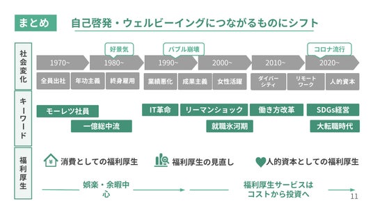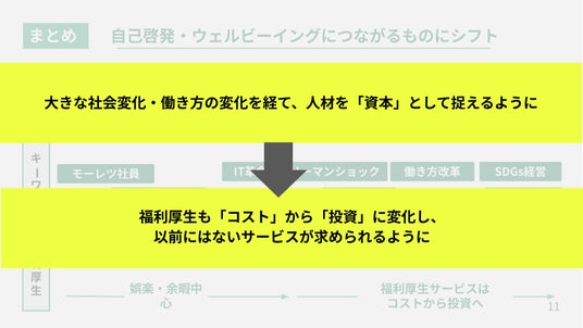 そしてここ数年で最も大きなトレンドシフトとしては、人材を“消費の対象”である「資源」ではなく“投資の対象”である「資本」と捉える人的資本経営の広がりにより、福利厚生の捉え方も「コスト」から「投資」へと変化しました。