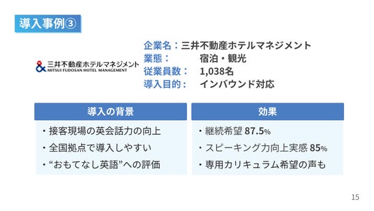現在、AI英会話「スピークバディ」の導入企業は100社を超え、製造業や金融業、IT・コンサルティング業、宿泊・観光業など幅広い業界で利用されています。