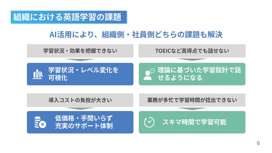 企業を取り巻く環境の変化のもと、かねてより組織では社員の英語学習についてあらゆる対策が講じられてきましたが、組織側・社員側ともに効果・効率の面で課題を抱えていました。
