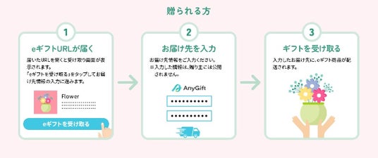 『AnyGift(エニーギフト)』は、相手の住所を知らなくてもLINEやメールで贈れるeギフト機能を、自社ECサイトに組み込み‧導入ができるサービスです。