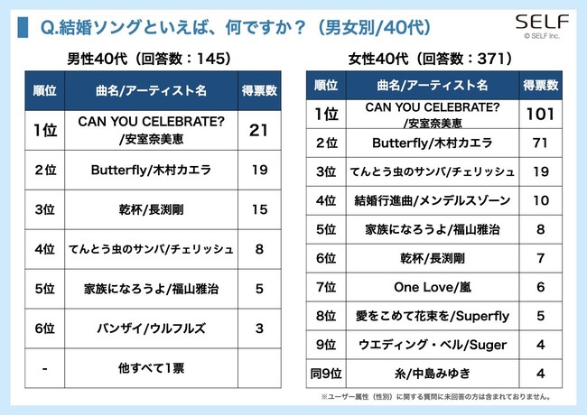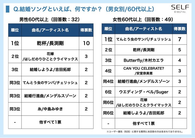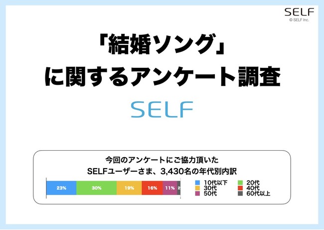 SELF株式会社(東京都新宿区)は、同社提供スマートフォン向けアプリ『SELF』にて、結婚ソングに関するアンケート調査を行いましたので結果をレポートいたします。