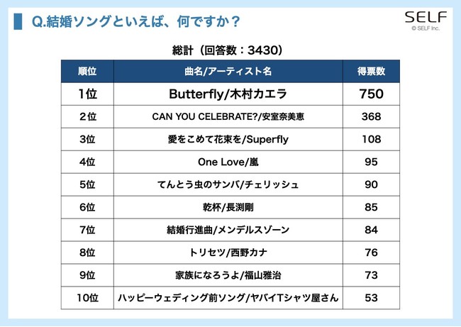 『Butterfly/木村カエラ』が、2位の『CAN YOU CELEBRATE?/安室奈美恵』にダブルスコアの差をつけての圧倒的な1位となりました。1位と2位が突出して票を集めていますが、ランクインした曲の多くは披露宴で流れる定番ソングの印象です。