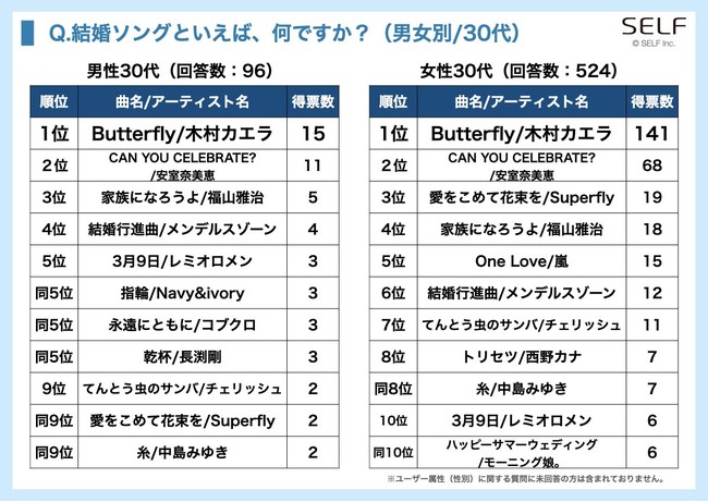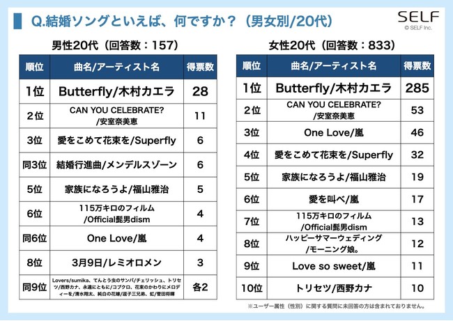 特に20代女性では『Butterfly』への票が際立って多く、34%超もの人が同曲を結婚ソングとして挙げています。