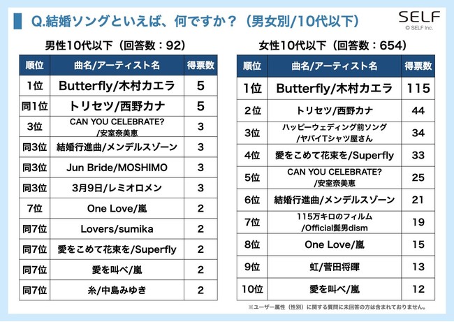 世代別でも見ていくと10代以下においては、1位『Butterfly』には変化がないものの、『トリセツ/西野カナ』が男女ともに上位にランクインする結果となりました。『ハッピーウェディング前ソング/ヤバイTシャツ屋さん』が10代以下女性から多く票を集めていることもわかりました。