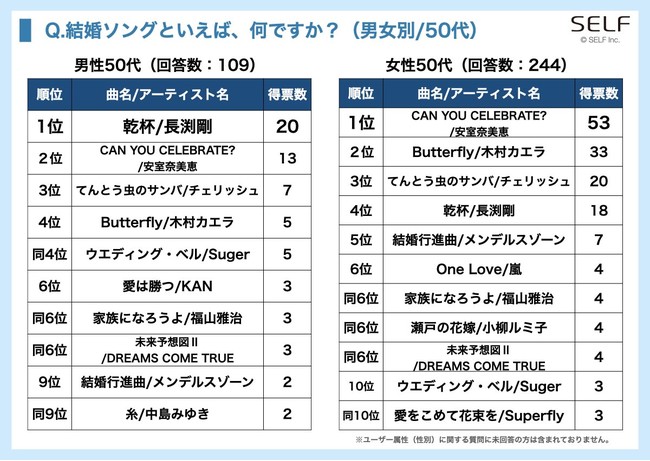 50代でも『CAN YOU CELEBRATE?』が『Butterfly』を上回ったのは変わりませんが、『乾杯』が男性で1位にランクインしました。『てんとう虫のサンバ』も上位に食い込んでおり、若年層のランキングとは異なる傾向が見られました。
