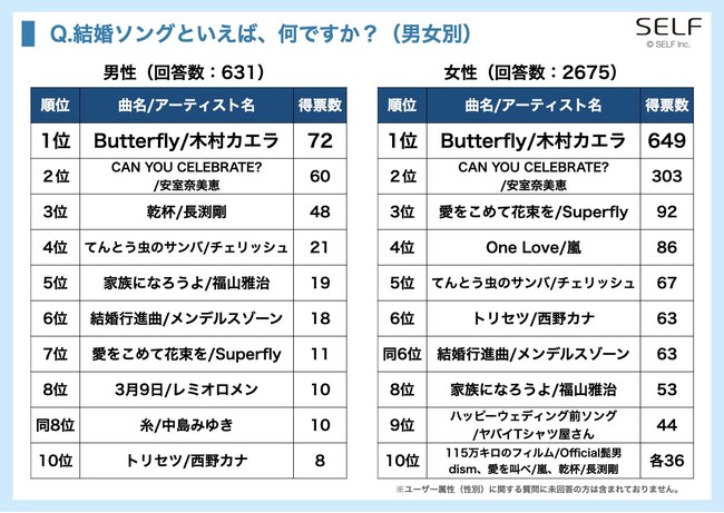 1位『Butterfly』と2位『CAN YOU CELEBRATE?』は全体結果と同じものの、3位以下は大きく異なりました。特に、女性では10位の『乾杯/長渕剛』が男性では3位にランクインしているなど、男女によって結婚ソングへのイメージは異なるようです。