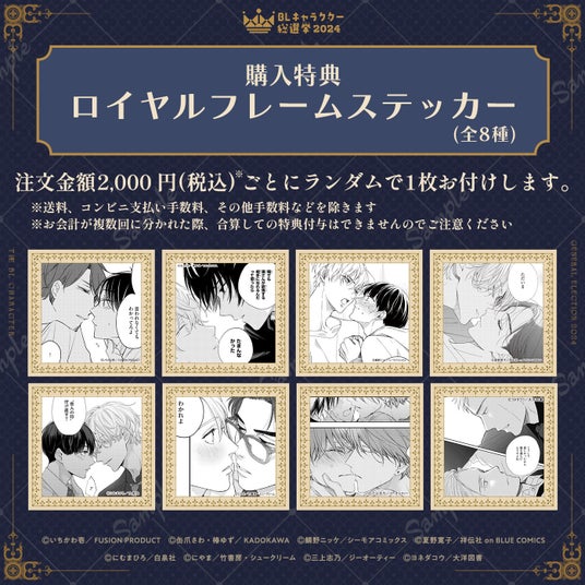 BLキャラクター総選挙2024グッズ通販では、購入特典として「ロイヤルフレームステッカー」をプレゼント!2,000円(税込)ごとにステッカー1枚を特典としてランダムで付与いたします。