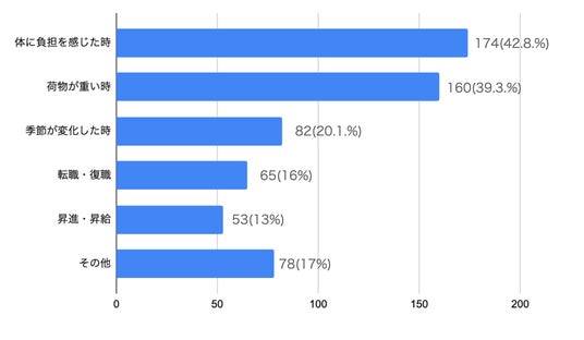 「体に負担を感じた時」が42.8%、「荷物が重い時」が39.3%と、毎日使用するビジネスバッグだからこそ機能性や軽量、耐久性を求めて買い替えを検討される方が多いことが読み取れました。