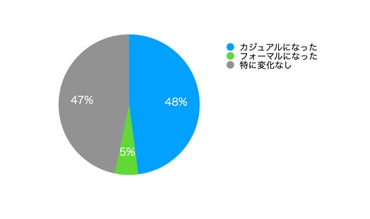 「服装がカジュアルになった」が47.8%と「フォーマルになった」5%を大きく上回り、年々カジュアル化が進んでいることが確認できました。