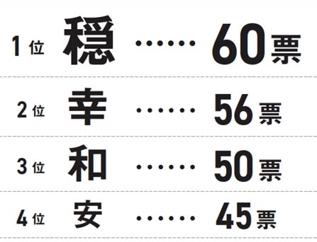 平穏な日々を連想する「穏」「和」「安」などの漢字は毎年上位にランクインするが、1位・2位が「平」「和」と世界情勢への不安が反映された2024年に比べると、「穏」「幸」「和」 「安」など穏やかな幸せの継続を望む結果となりました。自身やその周りの人が安定して穏やかに過ごしてほしい、という共感性の高い女性ならではの願いが顕著に現れています。
