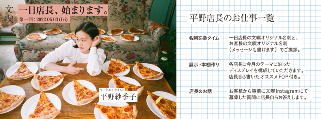 初回(6月3日)の一日店長は平野紗季子さん。店長や書店員を「本から広がる新しい世界の案内人」と考え、食の新しい楽しみ方を豊かな視点と言葉で紹介している平野さんにオファーし、実現しました。