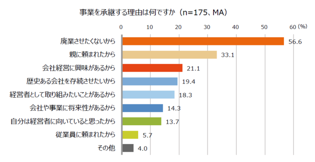 事業を承継する理由は、「廃業させたくないから」が最多(56.6%)。次いで「親に頼まれたから」 (33.1%)、「会社経営に興味があるから」(21.1%)
