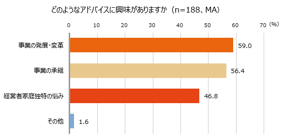 他の中小企業経営者や、その家庭での悩みの解決に向けたアドバイスに興味があると回答した188名に、どのようなアドバイスに興味があるか聞いたところ、「事業の発展・変革」が最も多く59.0%でした。