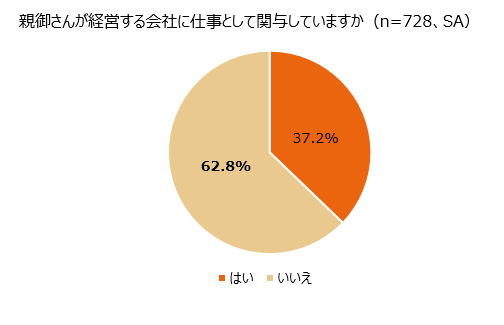 さらに、親御さんが経営する会社に仕事として関与しているか聞いたところ、37.2%が関与しており、役職では「取締役・役員級」(40.2%)が最も多く、次いで「一般社員」(34.3%)、「部長・課長級」(12.9%)、「アルバイト」(10.7%)の順でした。