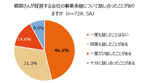 また、親御さんが経営する会社の事業承継について話し合ったことがあるか聞いたところ、「一度も話したことはない」が最も多く46.2%を占め、「何度も話したことがある」は31.3%、「十分に話し合ったことがある」は 8.0%でした。
