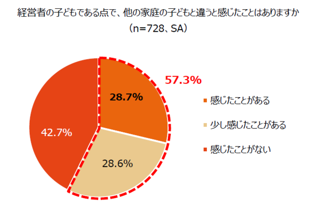 また、経営者の子どもである点で、他の家庭との違いを感じたことはあるか聞いたところ、「感じたことがある」(28.7%)、「少し感じたことがある」(28.6%)を合わせた約6割(57.3%)が感じたことがあると回答しました。自由回答記述には「自身の名字が会社名である」、「親の顔に泥を塗るようなことはできないと小学生のころから思ってきた」、「家に仕事の電話がかかってきたり、取引先の方が来たりする」など日々の生活のなかで親御さんが経営者と感じるエピソードが寄せられました。