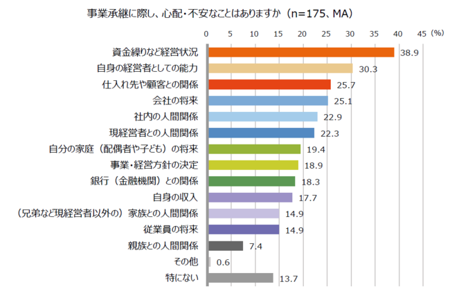 また、会社の事業を「継ぐ予定」と回答した175名に、事業承継に際し、心配・不安なことを聞いたところ、最も多かった回答は「資金繰りなど経営状況」(38.9%)で、次いで「自身の経営者としての能力」(30.3%)、「仕入れ先や顧客との関係」(25.7%)、「会社の将来」(25.1%)と続きました。