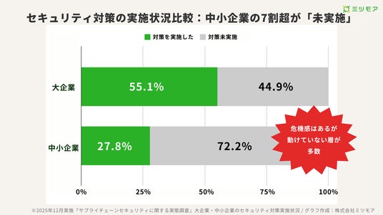 「危機感はあるが動けない」。中小企業の7割超がセキュリティ対策未実施(72.2%)、実施率は大企業の約半分にとどまる