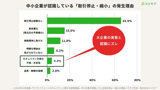 一方、中小企業において取引停止を経験した企業で理由として挙げられたのは「景気悪化(15.6%)」「価格競争(11.8%)」が上位で、「セキュリティ」はわずか4.3%にとどまりました。