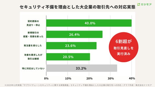 大企業の66.8%が、セキュリティ不備を理由に「契約停止や改善要求などの取引見直し」を実行したと回答しています。具体的には、「契約更新を見送った・停止した」が40.0%、「新規取引の提案・見積もりを断った」が26.4%にのぼります。